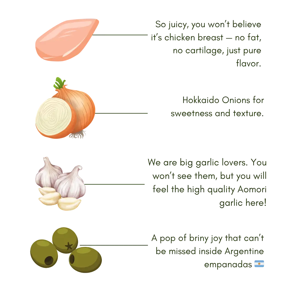 Harina, pollo, cebollas, morron, aceitunas, aceite vegetal, margarina, sal, especias.
