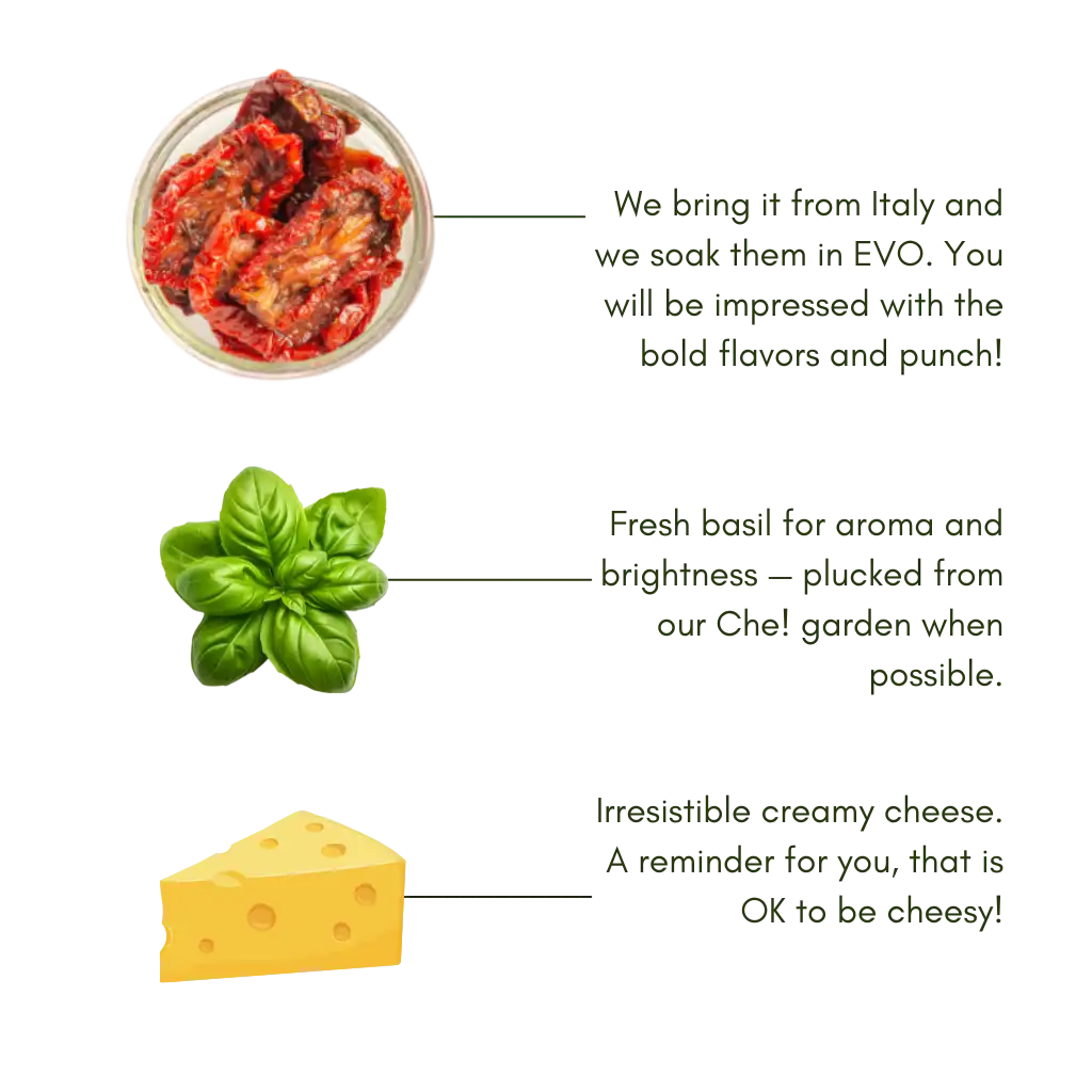 南イタリアの太陽を浴びたサンドライトマト、フレッシュバジル、そして濃厚なチーズが贅沢に詰まったエンパナーダ! プーリア州産のエキストラバージンオリーブオイルを使用し、ハーブとスパイスで1ヶ月以上じっくり漬け込んだ、酸味が効いたパンチのあるトマトが魅力です。