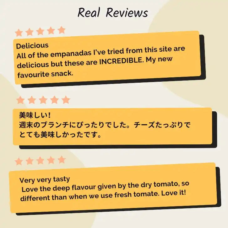 We're so happy to be able to enjoy delicious Argentine empanadas so far away from home. Delicious, with a good filling, homemade dough, and a great variety. Door-to-door service to my home in Tokyo. They've earned a regular customer here. Highly recommended! Thank you Kari!