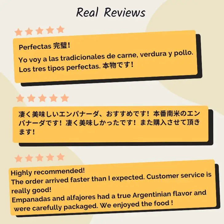 I ordered a variety empanadas and they arrived on time and tasted great. Very attentive customer service and they responded quickly to my emails when I had to change the delivery date. Thank you Karina! Will order again in the future.